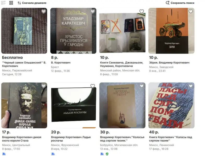 Збор твораў Васіля Быкава ў чатырох тамах прадаюць за 40 рублёў. Але можна знайсці і паасобку. Напрыклад, “Знак бяды” каштуе 15 рублёў, зборнік твораў “Пайсці і не вярнуцца” з аднайменнай аповесцю, а таксама творам “Яго батальён” 1979 года выдання – 20 рублёў. А кніга аповедаў у перакладзе на рускую мову з творамі “Дажыць да світання”, “Яго батальён”, “Воўчая зграя”, “Сотнікаў” і “Абеліск” – 4 рублі. За такую ж суму прадаюць кнігу Элізы Ажэшкі “У правінцыі”, але таксама на рускай мове.