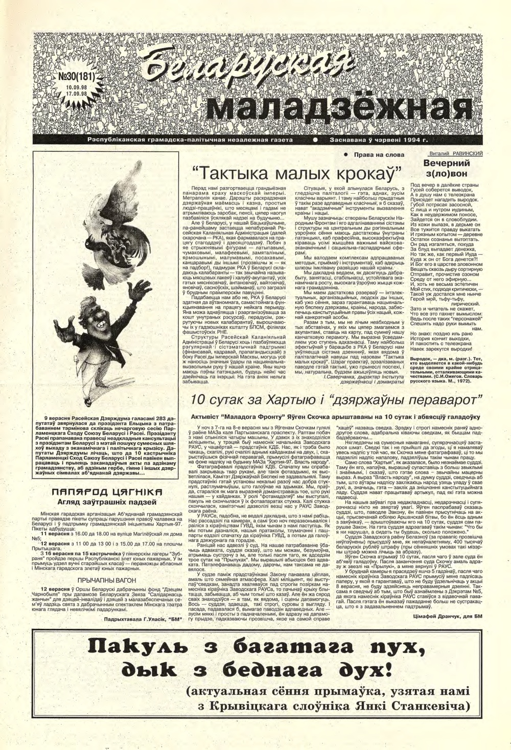 «Беларуская маладзёжная» (1994 - 2002) — беларуская газэта, дадатак да аднайменнай радыёстанцыі. Зарэгістраваная ў сакавіку 1994 году. У ёй друкаваліся расшыфроўкі радыйных гутарак, анонсы этэраў і ўсё, што не зьмяшчалася ў радыёфармат. Калі радыёстанцыю зачынілі, газэта засталася. Галоўны рэдактар — Тацьцяна Мельнічук. Традыцыйны фармат — 8 старонак А3. Газэта асьвятляла нараджэньне й разьвіцьцё палітычнай апазыцыі сярэдзіны-канца 1990-х, дзейнасьць незарэгістраваных моладзевых аб'яднаньняў з усіх бакоў палітычнага сьпектру, сачыла за разьвіцьцём й актуальным станам альтэрнатыўнай моладзевай культуры Беларусі. З 1995 па 1998 рэдакцыя газэты праводзіла у Менску вулічны рок-фэст «Купальле з Беларускай маладзёжнай». Апошні нумар выйшаў у чэрвені 2002 году. У кастрычніку 2003 году пасьведчаньне аб рэгістрацыі было скасаванае міністэрствам інфармацыі РБ. Крыница: be-tarask.wikipedia.org
