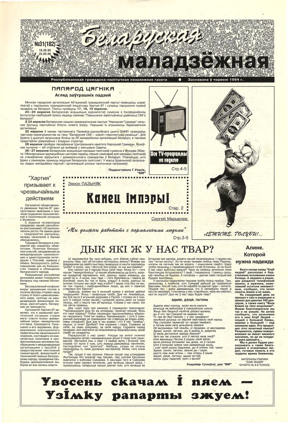 «Беларуская маладзёжная» (1994 - 2002) — беларуская газэта, дадатак да аднайменнай радыёстанцыі. Зарэгістраваная ў сакавіку 1994 году. У ёй друкаваліся расшыфроўкі радыйных гутарак, анонсы этэраў і ўсё, што не зьмяшчалася ў радыёфармат. Калі радыёстанцыю зачынілі, газэта засталася. Галоўны рэдактар — Тацьцяна Мельнічук. Традыцыйны фармат — 8 старонак А3. Газэта асьвятляла нараджэньне й разьвіцьцё палітычнай апазыцыі сярэдзіны-канца 1990-х, дзейнасьць незарэгістраваных моладзевых аб'яднаньняў з усіх бакоў палітычнага сьпектру, сачыла за разьвіцьцём й актуальным станам альтэрнатыўнай моладзевай культуры Беларусі. З 1995 па 1998 рэдакцыя газэты праводзіла у Менску вулічны рок-фэст «Купальле з Беларускай маладзёжнай». Апошні нумар выйшаў у чэрвені 2002 году. У кастрычніку 2003 году пасьведчаньне аб рэгістрацыі было скасаванае міністэрствам інфармацыі РБ. Крыница: be-tarask.wikipedia.org