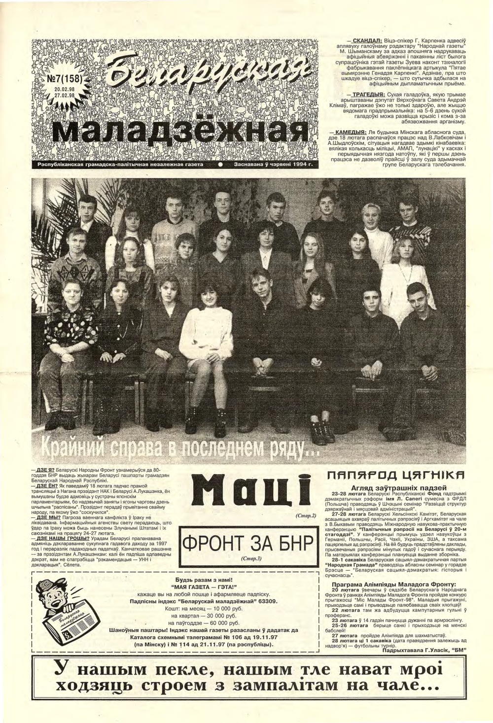 «Беларуская маладзёжная» (1994 - 2002) — беларуская газэта, дадатак да аднайменнай радыёстанцыі. Зарэгістраваная ў сакавіку 1994 году. У ёй друкаваліся расшыфроўкі радыйных гутарак, анонсы этэраў і ўсё, што не зьмяшчалася ў радыёфармат. Калі радыёстанцыю зачынілі, газэта засталася. Галоўны рэдактар — Тацьцяна Мельнічук. Традыцыйны фармат — 8 старонак А3. Газэта асьвятляла нараджэньне й разьвіцьцё палітычнай апазыцыі сярэдзіны-канца 1990-х, дзейнасьць незарэгістраваных моладзевых аб'яднаньняў з усіх бакоў палітычнага сьпектру, сачыла за разьвіцьцём й актуальным станам альтэрнатыўнай моладзевай культуры Беларусі. З 1995 па 1998 рэдакцыя газэты праводзіла у Менску вулічны рок-фэст «Купальле з Беларускай маладзёжнай». Апошні нумар выйшаў у чэрвені 2002 году. У кастрычніку 2003 году пасьведчаньне аб рэгістрацыі было скасаванае міністэрствам інфармацыі РБ. Крыница: be-tarask.wikipedia.org
