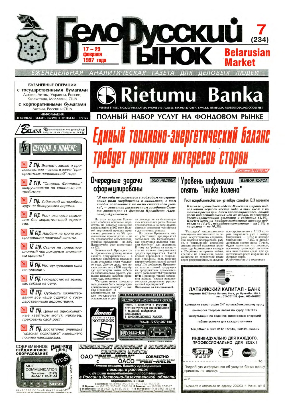 «Белорусский рынок» — еженедельная аналитическая газета для деловых людей. Учредитель — КМП «Белорусский рынок». Издается при содействии РИА “Новости”. Выходит раз в две недели. Ответственность за точность приведенных фактов, цитат, цифр, собственных имен, географических названий и прочих сведенйй а также за разглашение закрытой информации несут авторы. Редакция может публиковать статьи в порядке обсуждения, не разделяя точку зрения автора.