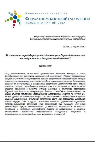 Пацвярджаючы сваю поўную падтрымку дыялогу, мы звяртаем увагу ўсіх яго ўдзельнікаў на неабходнасць унясення зменаў у парадак наступных дзеянняў і структуру арганізацыі Еўрапейскага дыялогу па мадэрнізацыі. Разам з відавочнымі дасягненнямі мы бачым небяспечныя тэндэнцыі: фармалізацыю мерапрыемстваў дыялогу на ўзроўні ЕС, нізкі ўзровень улучанасці беларускіх грамадскіх стейкхолдараў у працэс дыялогу, абмежаваны патэнцыял экспертных груп для распрацоўкі дэталёвых планаў рэформ.
