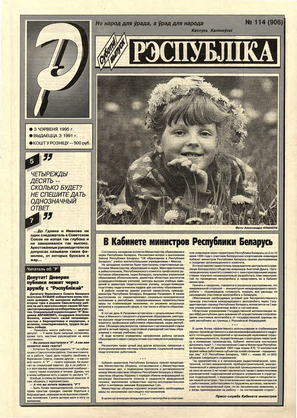 «Рэспубліка» — газета для тых, хто самастойна прымае рашэнні. Заснавальнік - Савет Міністраў Рэспублікі Беларусь. Выдаецца з чэрвеня 1991. Газета выходзіць 250 разоў у год. Аўтары апублікаваных матэрыялаў нясуць адказнасць за падбор і дакладнасць фактаў, іх меркаванні неабавязкова адлюстроўваюць пункт гледжання рэдакцыі. Рукапісы, фотаздымкі і малюнкі не рэцэнзуюцца і не вяртаюцца.
