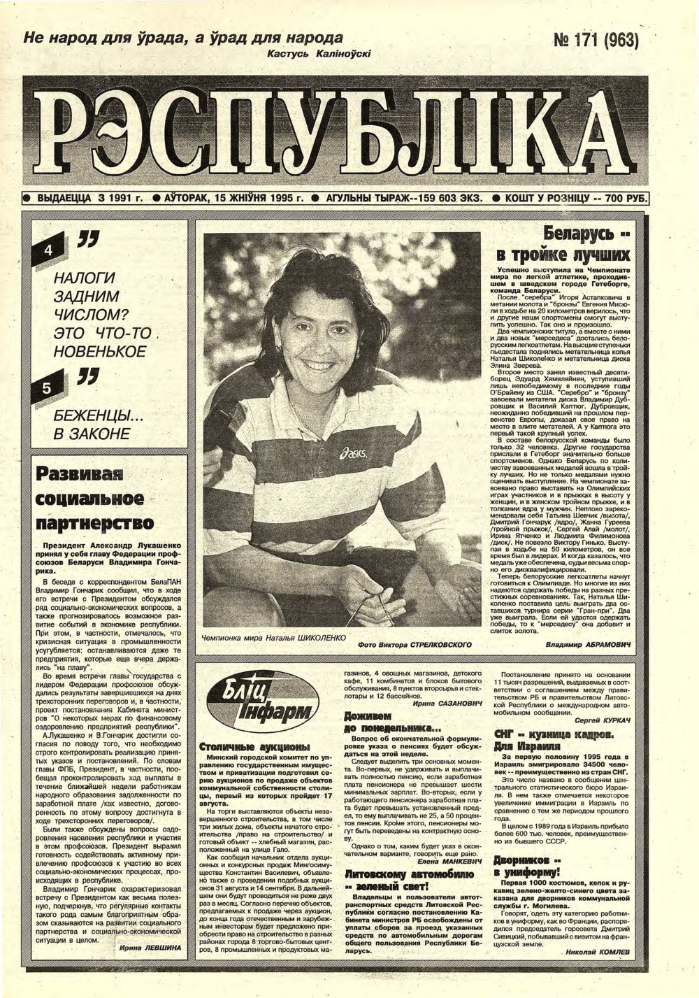 «Рэспубліка» — газета для тых, хто самастойна прымае рашэнні. Заснавальнік - Савет Міністраў Рэспублікі Беларусь. Выдаецца з чэрвеня 1991. Газета выходзіць 250 разоў у год. Аўтары апублікаваных матэрыялаў нясуць адказнасць за падбор і дакладнасць фактаў, іх меркаванні неабавязкова адлюстроўваюць пункт гледжання рэдакцыі. Рукапісы, фотаздымкі і малюнкі не рэцэнзуюцца і не вяртаюцца.