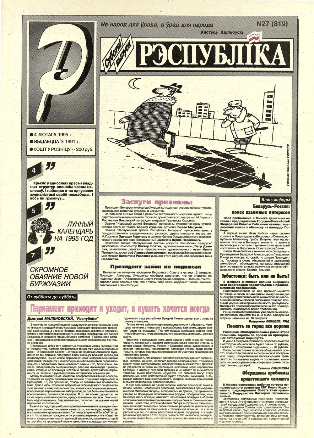 «Рэспубліка» — газета для тых, хто самастойна прымае рашэнні. Заснавальнік - Савет Міністраў Рэспублікі Беларусь. Выдаецца з чэрвеня 1991. Газета выходзіць 250 разоў у год. Аўтары апублікаваных матэрыялаў нясуць адказнасць за падбор і дакладнасць фактаў, іх меркаванні неабавязкова адлюстроўваюць пункт гледжання рэдакцыі. Рукапісы, фотаздымкі і малюнкі не рэцэнзуюцца і не вяртаюцца.