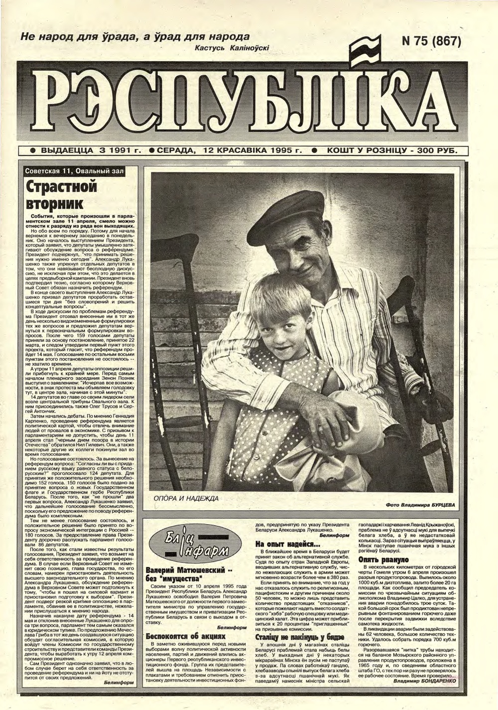 «Рэспубліка» — газета для тых, хто самастойна прымае рашэнні. Заснавальнік - Савет Міністраў Рэспублікі Беларусь. Выдаецца з чэрвеня 1991. Газета выходзіць 250 разоў у год. Аўтары апублікаваных матэрыялаў нясуць адказнасць за падбор і дакладнасць фактаў, іх меркаванні неабавязкова адлюстроўваюць пункт гледжання рэдакцыі. Рукапісы, фотаздымкі і малюнкі не рэцэнзуюцца і не вяртаюцца.