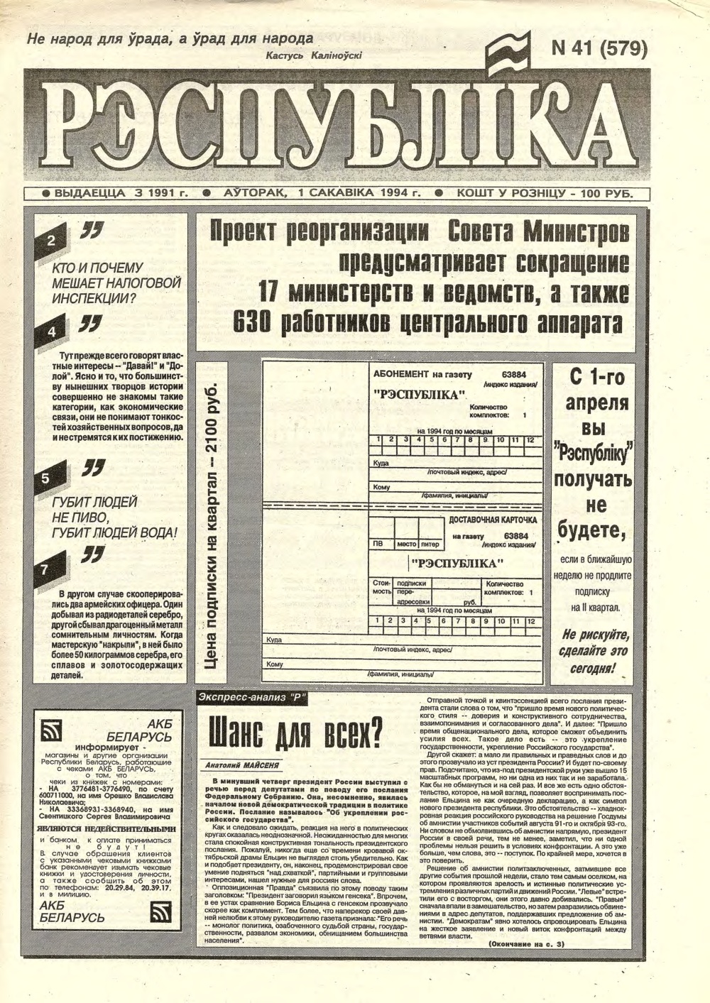 «Рэспубліка» — газета для тых, хто самастойна прымае рашэнні. Заснавальнік - Савет Міністраў Рэспублікі Беларусь. Выдаецца з чэрвеня 1991. Газета выходзіць 250 разоў у год. Аўтары апублікаваных матэрыялаў нясуць адказнасць за падбор і дакладнасць фактаў, іх меркаванні неабавязкова адлюстроўваюць пункт гледжання рэдакцыі. Рукапісы, фотаздымкі і малюнкі не рэцэнзуюцца I не вяртаюцца.