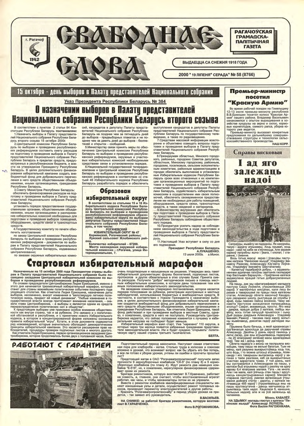 «Свабоднае слова» — Рагачоўская грамадска-палітычная газета. Выдаецца са снежня 1918 года. Аўтары апублікаваных матэрыялаў нясуць адказнасць за падбор і дакладнасць фактаў. Іх меркаванні не заўсёды супадаюць з меркаваннем рэдакцыі. Рэдакцыя пакідае за сабой права не ўступаць у перапіску з чытачамі.