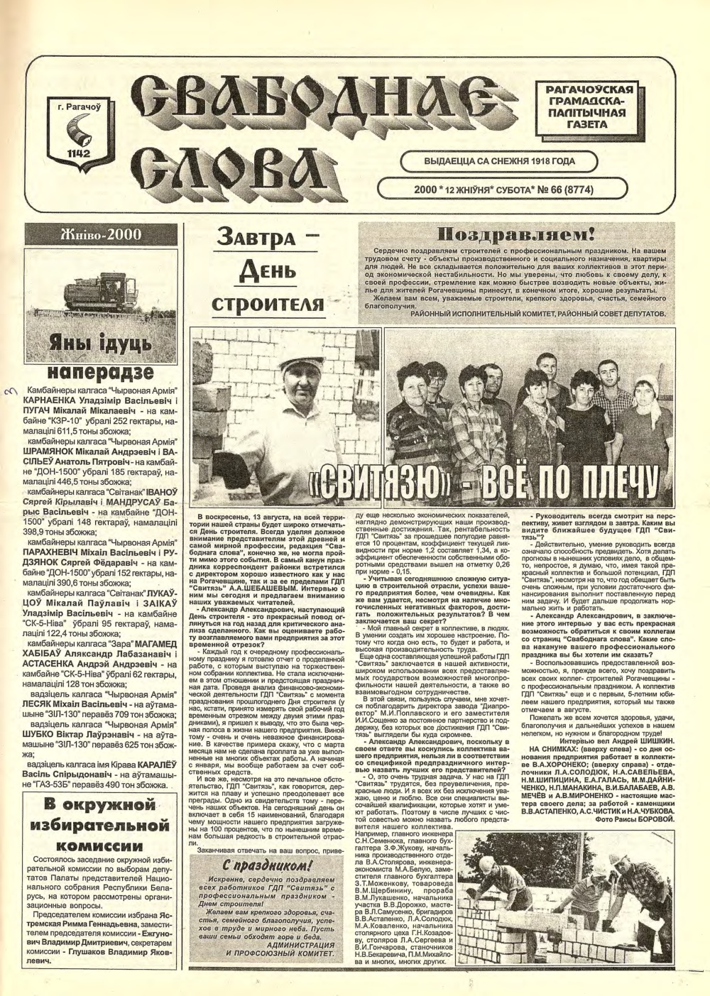 Свабоднае слова (Рагачоў) 66 (8774) 2000
