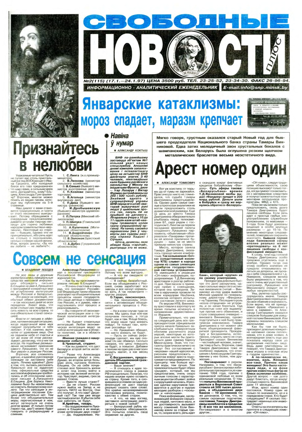 «Свободные новости плюс» — информационно-аналитический еженедельник. Издается с сентября 2002 года. Учредители: Белорусская научно-промышленная ассоциация и промышленно-коммерческая компания «Белфакс». За текст рекламы несет ответственность рекламодатель.