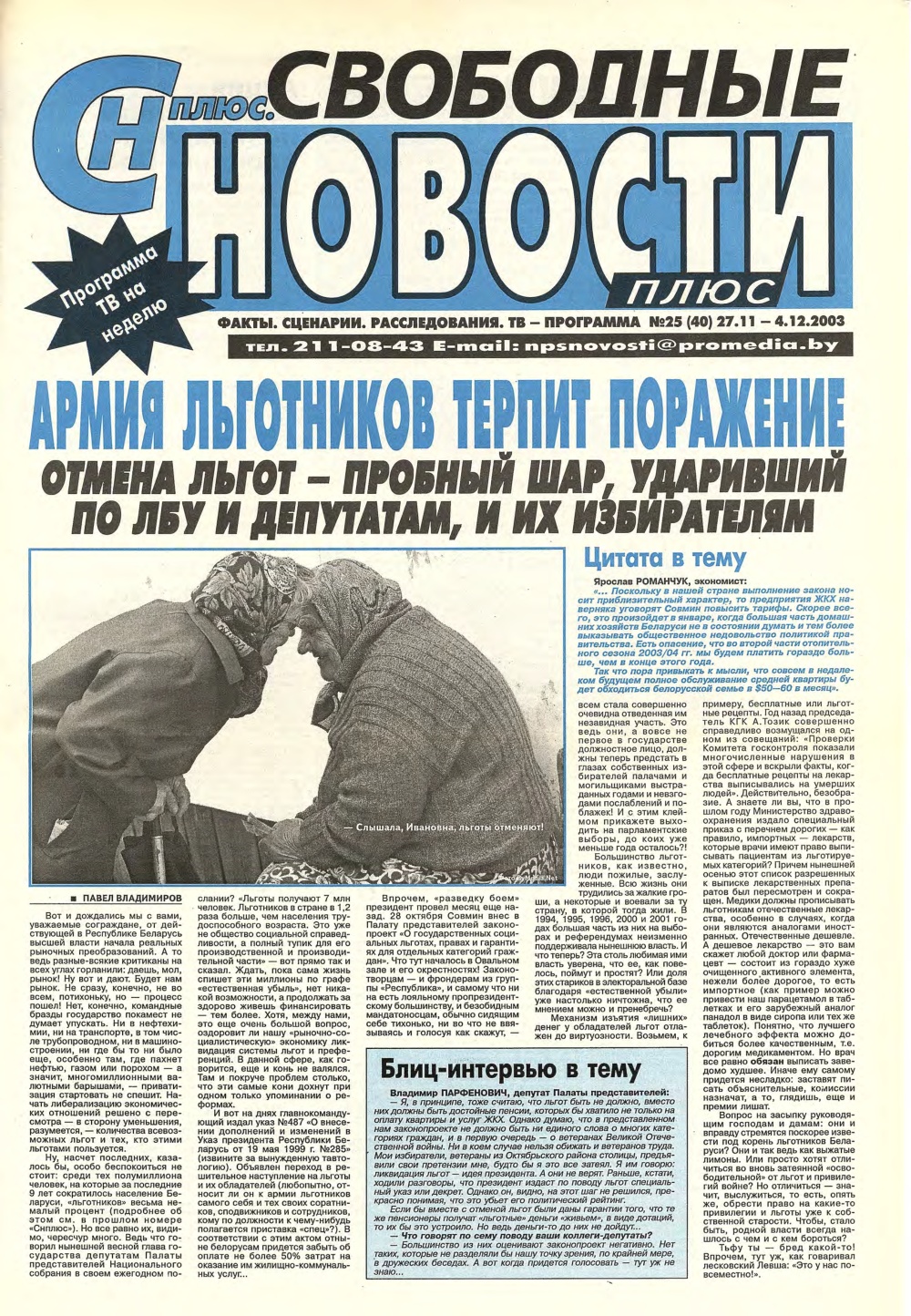 «Свободные новости плюс» — информационно-аналитический еженедельник. Издается с сентября 2002 года. Учредители: Белорусская научно-промышленная ассоциация и промышленно-коммерческая компания «Белфакс». За текст рекламы несет ответственность рекламодатель.