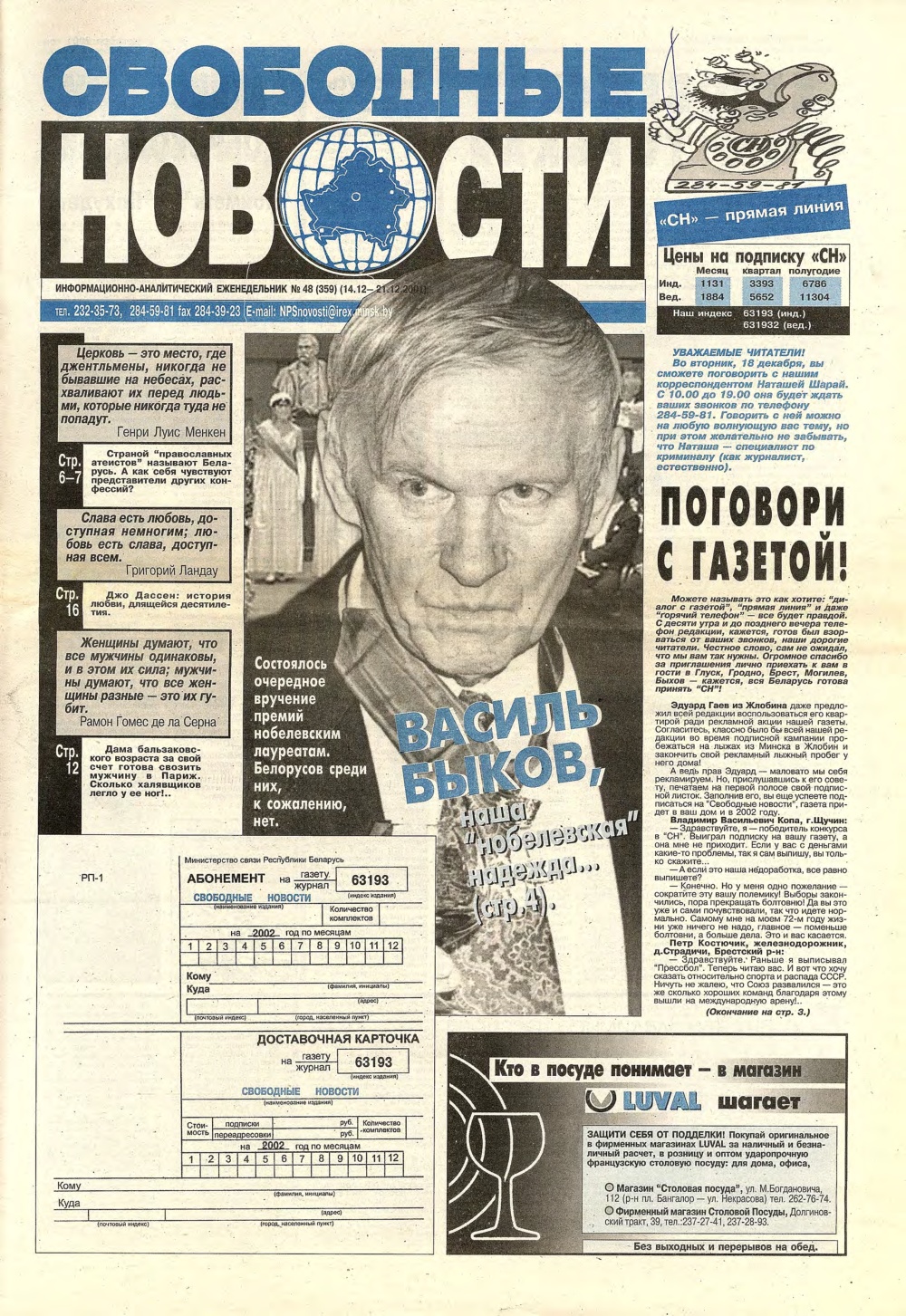 «Свободные новости плюс» — информационно-аналитический еженедельник. Издается с сентября 2002 года. Учредители: Белорусская научно-промышленная ассоциация и промышленно-коммерческая компания «Белфакс». За текст рекламы несет ответственность рекламодатель.