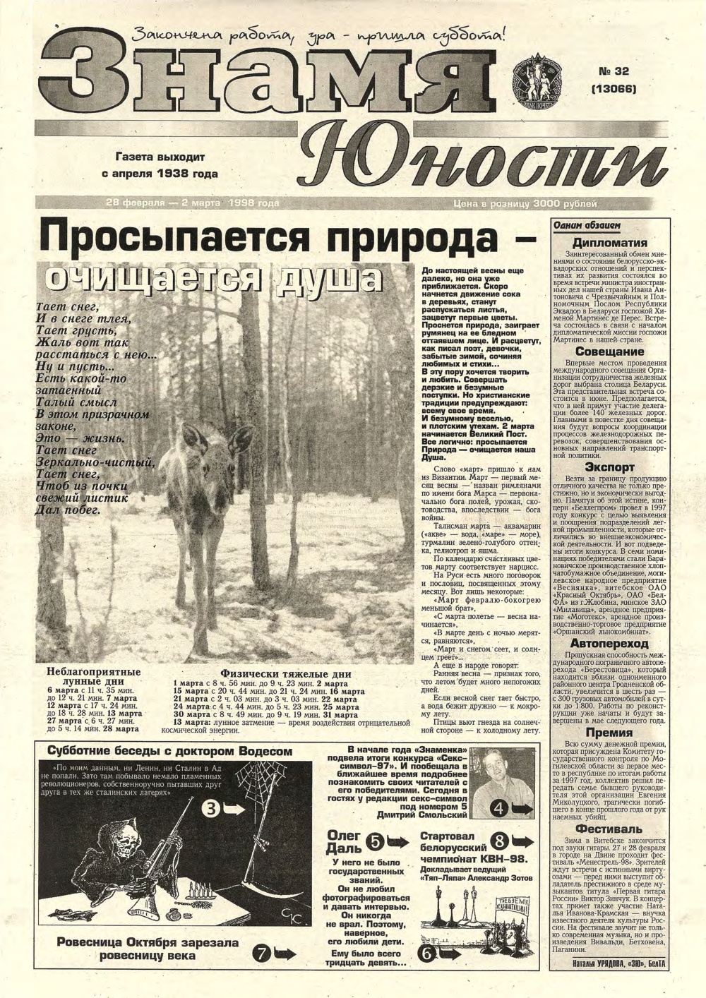 «Знамя юности» — общественно-политическая газета Белоруссии. Газета образована в 1938 году как совместный печатный орган Центрального комитета и Минского областного комитета ЛКСМ Белоруссии. Первый номер вышел 10 апреля 1938 года. Называлась газета «Сталинская молодёжь». Учредителем газеты с 1956 года являлся ЦК ЛКСМ Белоруссии. В годы Великой Отечественной войны газета выходила на одном из фронтов Красной Армии в виде листовки формата А4. Первый полноформатный послевоенный номер газеты «Сталинская молодёжь» вышел 6 июля 1945 года. В июне 1956 года газета «Сталинская молодёжь» переименована в газету «Знамя юности». Крыніца: ru.wikipedia.org